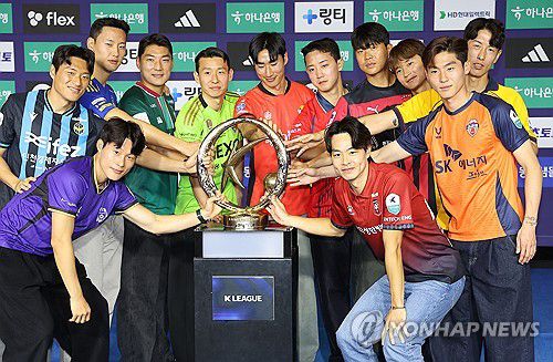 (서울=연합뉴스) 김성민 기자 = 25일 서울 서대문구 스위스 그랜드호텔 컨벤션센터에서 열린 '하나은행 K리그 2026 개막 미디어데이'에서 각 팀 선수들이 기념촬영을 하고 있다. 왼쪽부터 아래부터 시계방향으로 안양 FC 이창용, 인천 유나이티드 이명주, 울산 HD FC 정승현, 대전 하나 시티즌 주민규, 전북 현대 모터스 김태환, 강원 FC 서민우, 포항