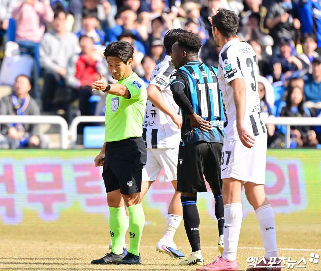 28일 오후 인천축구전용경기장에서 열린 '하나은행 K리그1 2026' 인천유나이티드와 FC서울의 경기, 송민석 주심이 골킥을 선언하고 있다. 김한준 기자 kowel@xportsnews.com