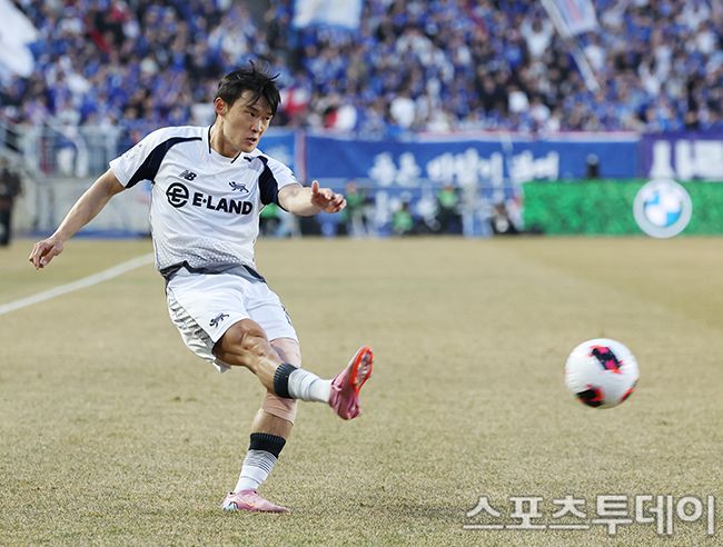 하나은행 K리그2 2026 수원삼성과 서울이랜드 경기가 28일 오후 수원월드컵경기장에서 열렸다. 서울이랜드 오인표가 후반전 센터링을 하고 있다.2026.02.28. [스포츠투데이 권광일 기자 sports@stoo.com]
