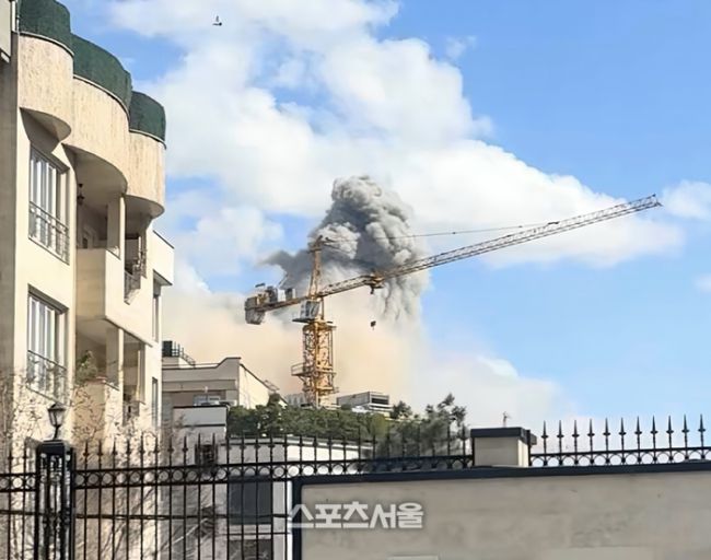 이기제가 1일 이란 테헤란 대사관에서 찍은 폭발 사진.제공 | 이기제 돌고 돌아, 그리고 또 돌아 이기제(35)는 고국 땅을 밟았다. 이란 프로축구 페르시안 걸프 리그의 메스 라프산잔에서 뛰던 이기제는 지난달 28일 오후 2시 30분경 황급하게 버스에 올랐다. 알루미늄 아락과의 대결을 앞둔 날이었는데 미국과 이스라엘이 선제 타격을 가하면서 전쟁이 발발, 축