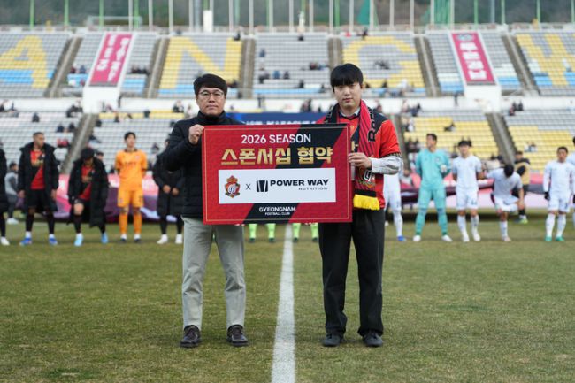제공 | 경남FC 경남FC와 도내 스포츠 뉴트리션 브랜드 파워웨이와 스폰서십을 체결했다. 경남은 14일 창원축구센터에서 열린 하나은행 K리그2 2026 3라운드 충북 청주전을 앞두고 파워웨이와 스폰서십 체결식을 진행했다. 파워웨이는 고강도 스포츠 환경에서 퍼포먼스 향상과 회복에 도움을 주는 탄산수소나트륨 젤 ‘SOBI FUEL’을 주력 제품으로 생산하는 스
