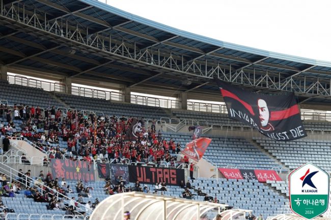 2024시즌 홈 응원석 폐쇄 조치에 관중석에서 응원하는 부천 서포터즈. 사진 | 한국프로축구연맹 이 정도면 ‘민폐’다. 부천FC1995 서포터는 지난 15일 부천종합운동장에서 열린 ‘하나은행 K리그1 2026’ 3라운드 울산HD(1-2 패)전에서 그라운드에 이물질을 던졌다. 하프타임 때 울산 선수단이 부천 응원석 앞에서 몸을 풀었을 때다. 한국프로축구연맹은