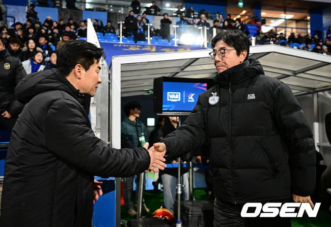 18일 오후 인천축구전용경기장에서 '하나은행 K리그1 2026' 4라운드 인천 유나이티드와 대전 하나시티즌의 경기가 열렸다. 인천은 1무 2패(승점1점)로 리그 10위, 대전은 3무(승점 3점)로 7위에 올라 있다. 양 팀 모두 첫 승이 간절한 상황이다. 경기 전 인천 윤정환 감독, 대전 황선홍 감독이 악수를 하고 있다. 2026.03.18 /cej@ose