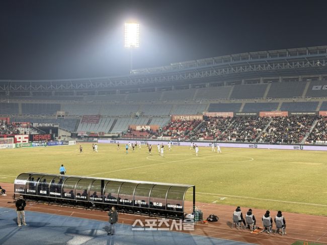 부천과 강원의 경기가 열린 18일 부천종합운동장 모습.부천 | 정다워 기자 “멍멍!” 부천FC1995와 강원FC의 K리그1 4라운드 경기가 열린 18일 부천종합운동장. 오후 7시 30분 킥오프 후 본부석 오른쪽 휠체어 전용석에서 ‘개 짖는 소리’가 지속해서 들려 왔다. 부천이 강원 페널티박스 근처에 접근하면 데시벨이 올라갔다. 평일 저녁 경기로 관중이 많지