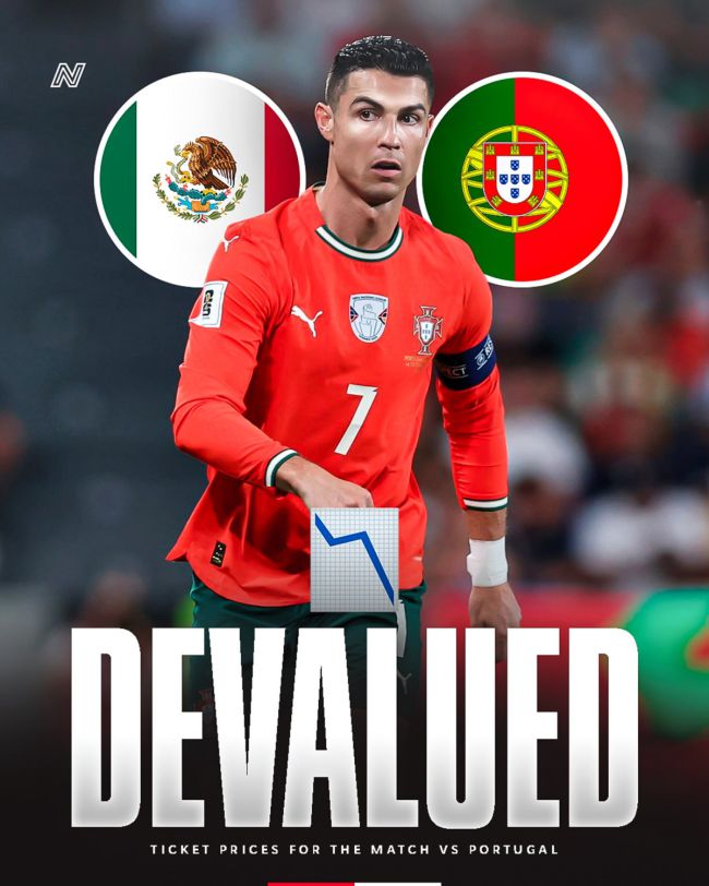 슈퍼스타 크리스티아누 호날두가 포르투갈 대표팀 명단에 들지 못하자, 멕시코와의 경기 티켓 값이 출렁였다. 글로벌 베팅 사이트 폺리마켓이 22일 멕시코와 포르투갈의 친선 경기 티켓 값이 호날두가 뛰지 못할 거라는 보도가 나온 뒤 50% 이상 폭락했다고 전했다. 멕시코와 포르투갈은 오는 29일 오전 10시 멕시코의 수도 멕시코 시티에 있는 에스타디오 아즈테카에