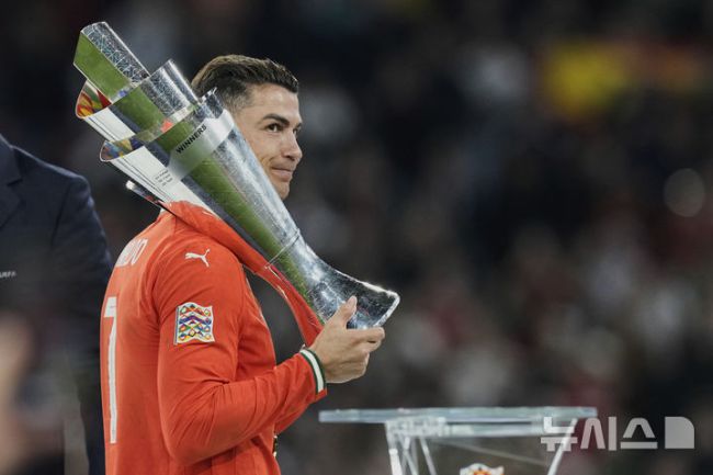 [뮌헨=AP/뉴시스] 포르투갈의 크리스티아누 호날두가 8일(현지 시간) 독일 뮌헨의 알리안츠 아레나에서 열린 2024-25 유럽축구연맹(UEFA) 네이션스리그(UNL) 스페인과의 결승전에서 승리해 우승한 후 트로피를 어깨에 메고 미소 짓고 있다. 포르투갈은 연장까지 2-2 무승부를 기록해 승부차기 끝에 5-3으로 승리해 6년 만에 정상에 올랐다. 호날두는