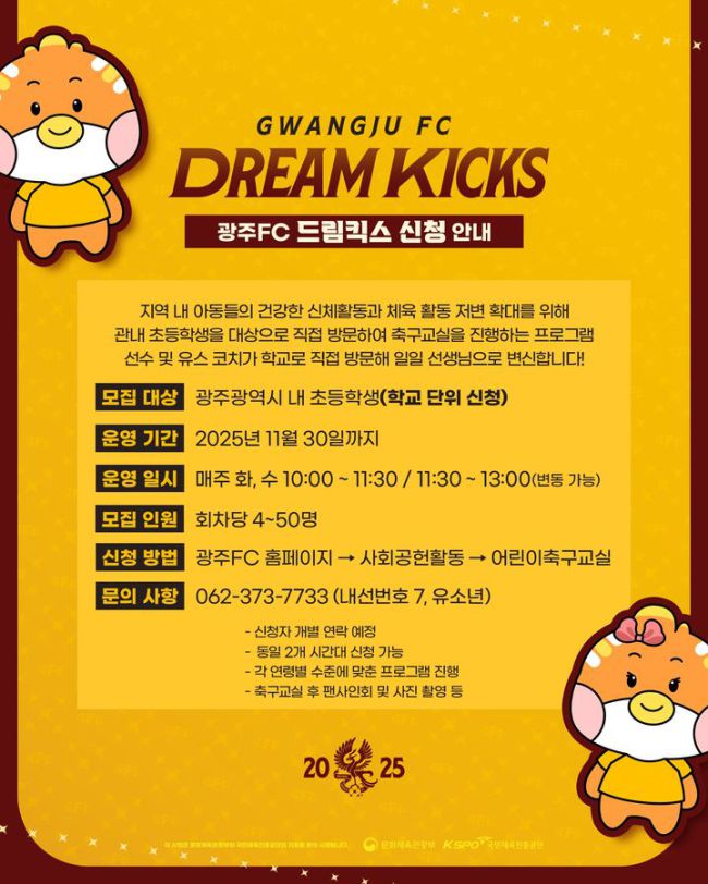[서울=뉴시스] 프로축구 K리그1 광주FC, 지역 초등생 위한 일일 축구교실 '광주FC 드림킥스' 운영. (사진=광주FC 제공) *재판매 및 DB 금지 [서울=뉴시스] 하근수 기자 = 프로축구 K리그1 광주FC가 지역 초등학생을 위한 일일 축구교실 '광주FC 드림킥스'를 운영한다고 6일 밝혔다. 해당 축구교실은 문화체육관광부와 국민체육진행공단의 지원을 받아