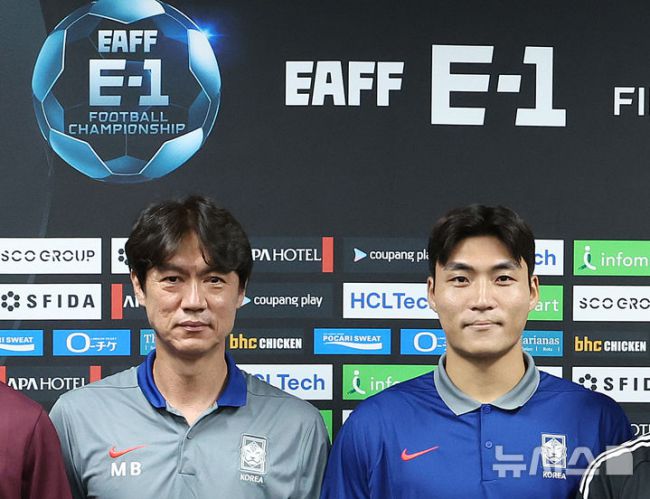 [용인=뉴시스] 이영환 기자 = 6일 오후 경기 용인시 처인구 용인미르스타디움에서 열린 2025 EAFF(동아시아축구연맹) E-1 챔피언십(동아시안컵) 기자회견에 참석한 홍명보 한국 남자 축구 대표팀 감독과 '부주장' 박진섭이 기념촬영을 하고 있다. 2025.07.06. 20hwan@newsis.com [서울=뉴시스]안경남 기자 = 국내파 위주로 '옥석 가