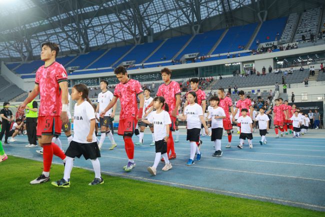 축구대표팀 선수들이 7일 중국전에 입장하는 모습. 사진 | 용인=연합뉴스 동아시아축구연맹(EAFF) E-1 챔피언십(동아시안컵)의 막이 오른 가운데 흥행은 ‘빨간불’이 예상된다. 홍명보 감독이 이끄는 축구대표팀은 7일 용인미르스타디움에서 열린 동아시안컵 남자부 중국과 개막전을 치렀다. 홍명보호는 이동경(김천상무)~주민규(대전하나시티즌)~김주성(FC서울)의