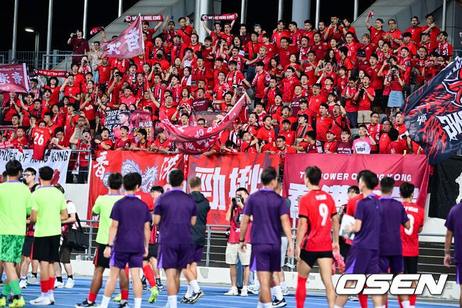 올 시즌'K리그 간판' 강상윤(전북), 이호재(포항)가 나란히 A매치 데뷔골을 터트렸다. 한국을 승리로 이끌었다. 홍명보 감독이 이끄는 한국 축구대표팀은 11일 오후 8시 용인 미르스타디움에서 홍콩과 2025 동아시아축구연맹(EAFF) E-1 챔피언십(동아시안컵) 2차전을 치러 2-0으로 승리했다. 경기종료 후 홍콩 응원단이 홍콩 축구대표팀을 응원하고 있다