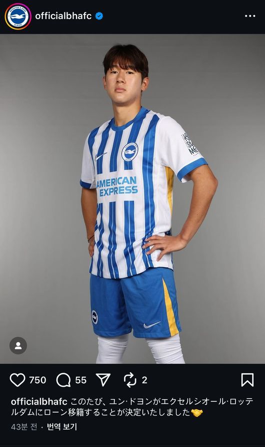 윤도영(19)이 네덜란드 에레디비시 클럽 엑셀시오르로 임대 이적하며 유럽 무대 도전에 나선다. 한국 선수가 엑셀시오르 유니폼을 입은 것은 김남일 이후 22년 만이다. 그런데 그의 원 소속팀 브라이튼이 임대 소식을 일본어로 알리는 어처구니없는 실수를 저질렀다. 엑셀시오르는 16일(한국시간) 공식 홈페이지를 통해 “브라이튼에서 임대 온 만 18세 공격수 윤도영