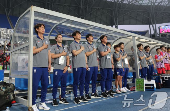 홍명보 감독과 대표팀 코칭스태프. 2025.7.7/뉴스1 ⓒ News1 김영운 기자 (서울=뉴스1) 안영준 기자 = 6월 월드컵 최종예선부터 7월 동아시안컵까지 이어진 바쁜 일정을 마친 홍명보호가 이제는 9월 미국 원정을 준비한다. 홍명보호의 외국인 코치 주앙 아로소와 티아고 마이아가 유럽으로 출국, 유럽에서 뛰는 국내 선수들을 전체적으로 점검한다. 대한축