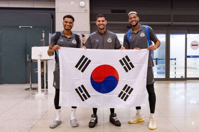 사진=쿠팡플레이 제공 뉴캐슬 유나이티드가 한국에 도착했다. 최근 입단한 ‘신입생’ 박승수는 태극기를 펼쳤다. 잉글랜드 프리미어리그(EPL) 뉴캐슬은 28일 오후 인천국제공항을 통해 입국했다. 1881년 창단한 뉴캐슬이 방한한 건 이번이 처음이다. 에디 하우 감독과 베테랑 수비수 댄 번, 특급 풀백 키어런 트리피어를 시작으로 조엘린통, 브루노 기마랑이스, 산