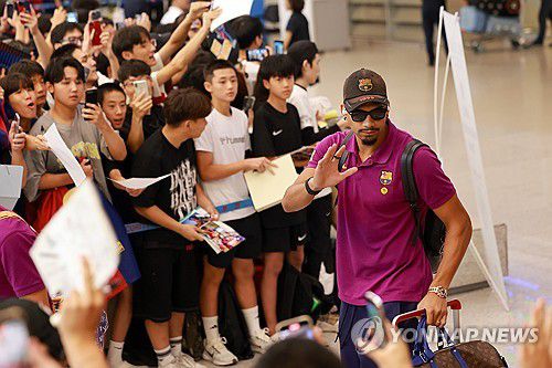 (영종도=연합뉴스) 신현우 기자 = 프리시즌 투어 중인 스페인 프로축구 FC바르셀로나의 로날드 아라우호가 29일 인천국제공항 제2여객터미널을 통해 입국해 팬에게 사인해주고 있다. 바르셀로나는 오는 31일 오후 8시 서울월드컵경기장에서 K리그1 FC서울과, 8월 4일 오후 8시 대구스타디움에서 K리그1 대구FC와 차례로 맞붙을 예정이다. 2025.7.29 n