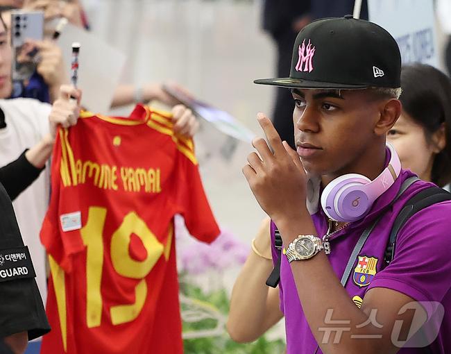 FC 바르셀로나의 공격수 라민 야말이 29일 오후 인천국제공항 2터미널을 통해 입국하고 있다. 지난 2010년 이후 15년 만에 한국을 찾은 바르셀로나는 오는 31일 오후 8시 서울월드컵경기장에서 K리그1 FC서울과 맞대결을 펼친 뒤 4일에는 대구FC와 친선경기를 치른다. 2025.7.29/뉴스1 ⓒ News1 김진환 기자 (서울=뉴스1) 안영준 기자 =