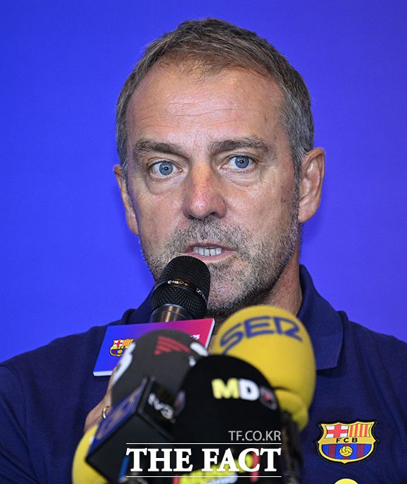 FC 바르셀로나 한지 플릭 감독이 30일 오후 서울 종로구 포시즌스 호텔 서울에서 열린 기자회견에 참석해 취재진의 질문에 답하고 있다. 'FC 바르셀로나 2025 아시아투어 에디션'의 일환으로 지난 2010년 이후 15년 만에 한국을 찾은 FC 바르셀로나는 오는 31일 오후 8시 서울월드컵경기장에서 K리그1 FC서울과 맞대결을 펼친 뒤, 8월 4일에는 대구