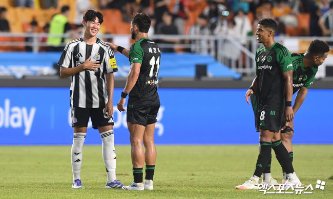 30일 오후 수원월드컵경기장에서 '2025 쿠팡플레이 시리즈' 팀 K리그와 뉴캐슬 유나이티드 FC의 경기, 팀 K리그가 김진규의 선제골로 1:0 승리를 거뒀다. 경기를 마친 뉴캐슬 박승수가 팀 K리그 세징야와 인사를 나누고 있다. 고아라 기자 iknow@xportsnews.com