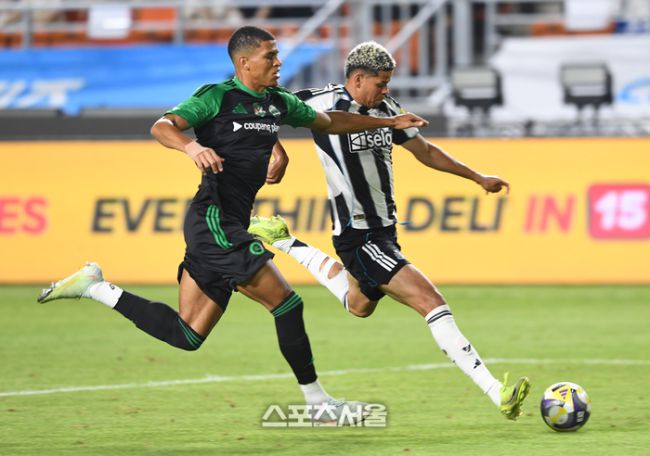 뉴캐슬 유나이티드의 윌 오술라(오른쪽)가 30일 수원월드컵경기장에서 열린 2025 쿠팡플레이시리즈 팀K리그와의 경기에서 팀K리그 카이오의 수비를 피해 슛을 하고 있다. 2025. 7. 30. 수원 | 박진업 기자 upandup@sportsseoul.com [기사제보 news@sportsseoul.com] Copyright ⓒ 스포츠서울&sportsseoul