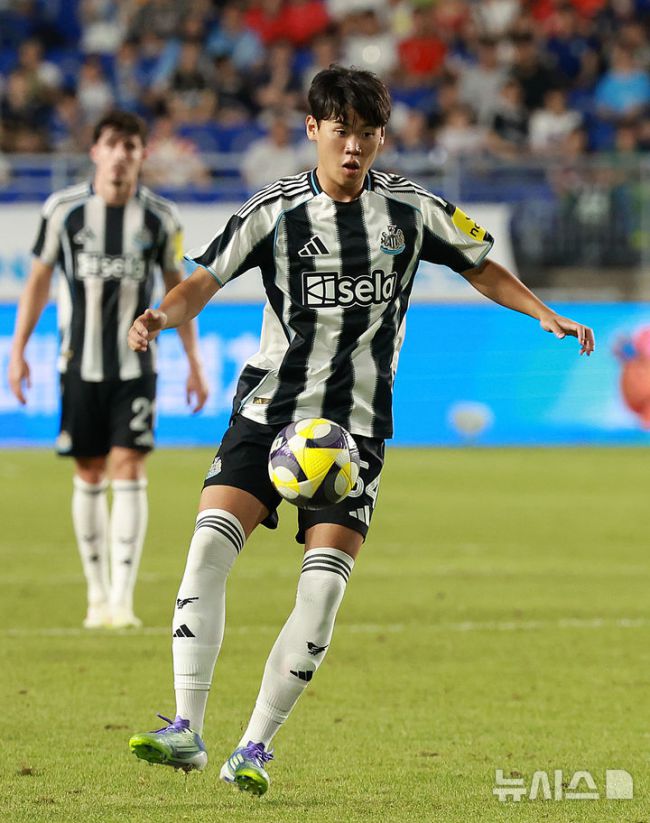 [수원=뉴시스] 이영환 기자 = 30일 오후 경기 수원시 팔달구 수원월드컵경기장에서 열린 2025 쿠팡플레이 시리즈 뉴캐슬 유나이티드와 팀 K리그의 경기, 뉴캐슬 박승수가 볼 트래핑을 하고 있다. 2025.07.30. 20hwan@newsis.com [수원·서울=뉴시스] 김진엽 하근수 기자 = 잉글랜드 프로축구 프리미어리그(EPL) 뉴캐슬 유나이티드 박승수