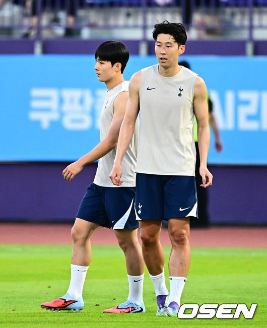2일 오후 안양종합운동장에서‘2025쿠팡플레이 시리즈’ 토트넘 훗스퍼 오픈 트레이닝이 열렸다.이날 오전에 열린 기자회견에서 손흥민은 토트넘과 이별을 발표했다. 토트넘은 3일 오후 8시 서울월드컵경기장에서 쿠팡플레이 시리즈 2차전 뉴캐슬 유나이티드와 친선 경기를 가진다. 손흥민의 토트넘 소속 마지막 경기일 수도 있다.토트넘 손흥민, 양민혁이 훈련을 하고 있다