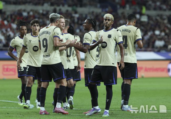 [서울=뉴시스] 김근수 기자 = 지난달 31일 서울 마포구 상암월드컵경기장에서 열린 FC 바르셀로나 2025 아시아 투어 FC 바르셀로나 대 FC서울의 경기, FC바르셀로나 라민 야말이 추가골을 넣고 기뻐하고 있다. 2025.07.31. ks@newsis.com [서울=뉴시스] 김진엽 기자 = 스페인 프로축구 프리메라리가 FC바르셀로나가 프로축구 K리그1