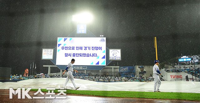 13일 오후 대구삼성라이온즈파크에서 ‘2025 신한 SOL Bank KBO 포스트시즌’ SSG 랜더스와 삼성 라이온즈의 준플레이오프(5전 3선승제) 3차전이 열렸다. 1회말 진행 도중 폭우로 경기가 중단되고 있다. 대구=김영구 MK스포츠 기자 [ⓒ MK스포츠, 무단전재 및 재배포 금지]