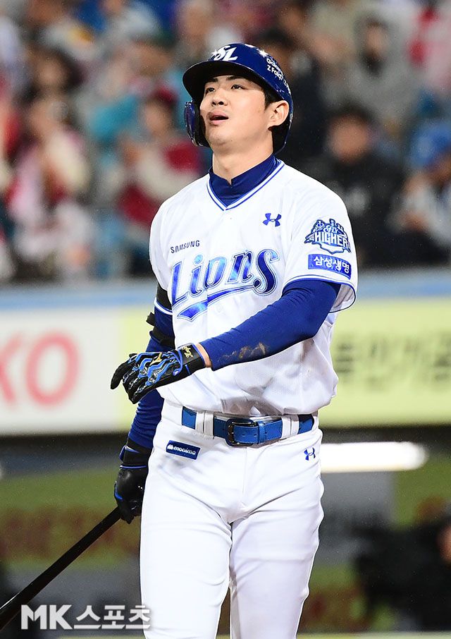 13일 오후 대구삼성라이온즈파크에서 ‘2025 신한 SOL Bank KBO 포스트시즌’ SSG 랜더스와 삼성 라이온즈의 준플레이오프(5전 3선승제) 3차전이 열렸다. 5회말 1사 1, 2루에서 삼성 구자욱이 16구 끝에 헛스윙 삼진을 당한 후 아쉬워 하고 있다. 대구=김영구 MK스포츠 기자 [ⓒ MK스포츠, 무단전재 및 재배포 금지]