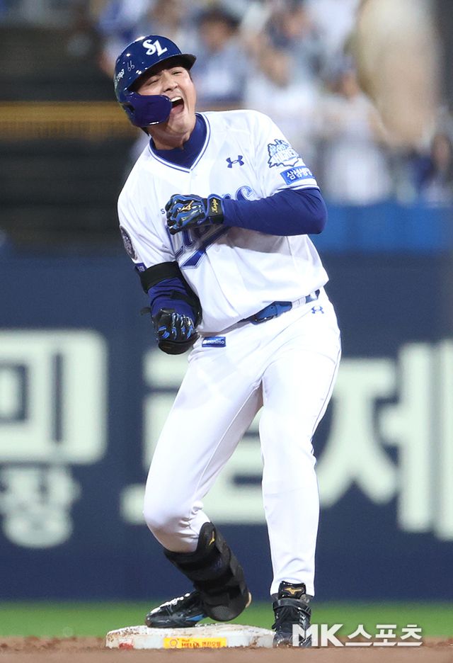 13일 오후 대구삼성라이온즈파크에서 ‘2025 신한 SOL Bank KBO 포스트시즌’ SSG 랜더스와 삼성 라이온즈의 준플레이오프(5전 3선승제) 3차전이 열렸다. 3회말 2사 2루에서 삼성 구자욱이 적시 2루타를 치고 진루한 후 환호하고 있다. 대구=김영구 MK스포츠 기자 [ⓒ MK스포츠, 무단전재 및 재배포 금지]
