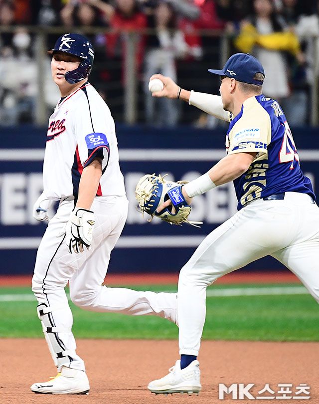8일 오후 서울 고척스카이돔에서 ‘2025 NAVER K-BASEBALL SERIES’ 한국과 체코의 평가전이 열렸다. 8회말 2사 1, 2루에서 대표팀 이재원이 1타점 2루타를 치고 런다운에 걸려 태그아웃 되고 있다. 고척(서울)=김영구 MK스포츠 기자 [ⓒ MK스포츠, 무단전재 및 재배포 금지]