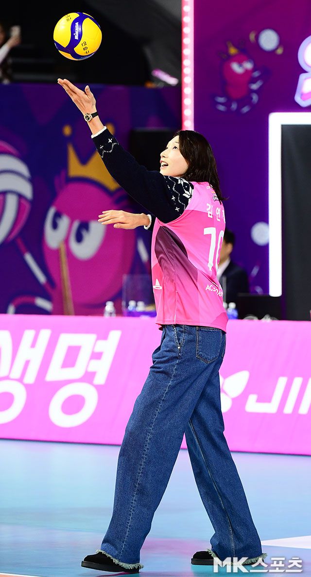 24일 오후 인천 삼산월드체육관에서 ‘진에어 2025~2026 V리그’ 여자부 흥국생명과 IBK기업은행 경기가 열렸다. 흥국생명은 8승 8패 승점 25점으로 리그 3위, 기업은행은 6승 10패 승점 21점으로 5위다. 경기에 앞서 흥국생명 어드바이저 김연경이 승리 기원 시구를 하고 있다. 인천=김영구 MK스포츠 기자 [ⓒ MK스포츠, 무단전재 및 재배포 금