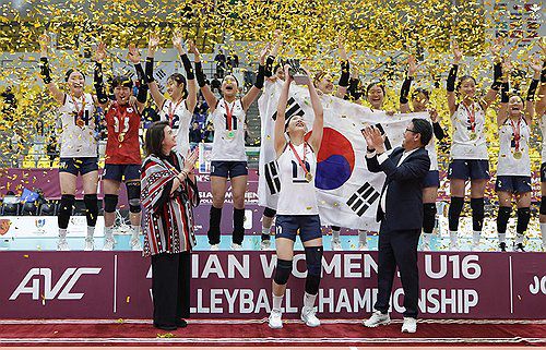 U-16 여자배구 아시아선수권 우승에 기뻐하는 선수들