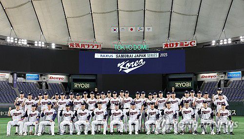 (도쿄=연합뉴스) 이동해 기자 = 한국 야구대표팀이 14일 일본 도쿄돔에서 월드베이스볼클래식(WBC) 대비 한일 평가전을 앞두고 그라운드에서 단체 사진을 찍고 있다. 2025.11.14 eastsea@yna.co.kr ▶제보는 카카오톡 okjebo ▶연합뉴스 앱 지금 바로 다운받기~ ▶네이버 연합뉴스 채널 구독하기 <저작권자(c) 연합뉴스, 무단 전재-재배