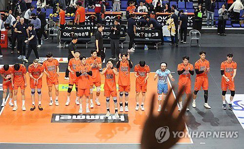 (부산=연합뉴스) 강선배 기자 = 18일 부산 강서체육관에서 열린 프로배구 V리그 남자부 OK저축은행 읏맨과 KB손해보험 스타즈의 경기. 세트 스코어 1대3으로 패한 OK저축은행 선수들이 관중들에게 인사하고 있다. 2025.11.18 sbkang@yna.co.kr ▶제보는 카카오톡 okjebo ▶연합뉴스 앱 지금 바로 다운받기~ ▶네이버 연합뉴스 채널 구독