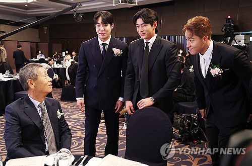 (서울=연합뉴스) 김성민 기자 = 8일 서울 강남구 리베라호텔에서 열린 '2025 뉴트리디데이 일구상 시상식'에서 김성근 감독이 선수들과 인사하고 있다. 왼쪽부터 김 감독, 원태인, 이정후, 안현민. 2025.12.8 ksm7976@yna.co.kr ▶제보는 카카오톡 okjebo ▶연합뉴스 앱 지금 바로 다운받기~ ▶네이버 연합뉴스 채널 구독하기 <저작권자