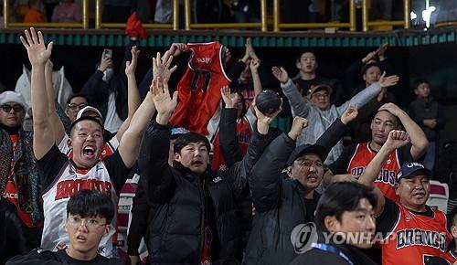 (창원=연합뉴스) 김동민 기자 = 9일 경남 창원체육관에서 열린 2025-2026 동아시아 슈퍼리그(EASL) 조별리그 C조 예선 창원 LG 세이커스와 몽골(XAC) 자크 브롱코스 경기 종료 후 XAC 팬이 XAC 선수단을 응원하고 있다. 이날 LG가 XAC에 98대 83으로 승리했다. 2025.12.9 image@yna.co.kr ▶제보는 카카오톡 okj