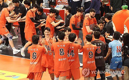(부산=연합뉴스) 강선배 기자 = 12일 부산 강서체육관에서 열린 프로배구 V리그 남자부 OK저축은행 읏맨과 대한항공 점보스의 경기에서 대한항공의 11연승을 저지하고 3-0으로 승리한 OK저축은행 선수들이 기쁨을 나누고 있다. 2025.12.12 sbkang@yna.co.kr ▶제보는 카카오톡 okjebo ▶연합뉴스 앱 지금 바로 다운받기~ ▶네이버 연합뉴