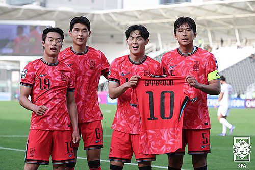 (서울=연합뉴스) 10일 사우디아라비아 리야드의 알샤바브 클럽 스타디움에서 열린 2026 AFC U-23 아시안컵 조별리그 C조 2차전 한국과 레바논의 경기. 한국선수들이 부상으로 빠진 강상윤의 유니폼을 들고 골 세리머니를 하고 있다. 2026.1.10 [대한축구협회 제공. 재판매 및 DB 금지] photo@yna.co.kr ▶제보는 카카오톡 okjebo