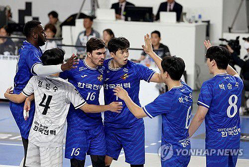 (서울=연합뉴스) 23일 천안유관순체육관에서 열린 2025-2026 프로배구 V리그 남자부 현대캐피탈과 한국전력의 경기. 한국전력 선수들이 득점 후 환호하고 있다. 2026.1.23 [한국전력 배구단 제공. 재판매 및 DB 금지] photo@yna.co.kr ▶제보는 카카오톡 okjebo ▶연합뉴스 앱 지금 바로 다운받기~ ▶네이버 연합뉴스 채널 구독하기