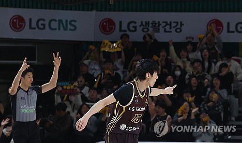 (창원=연합뉴스) 김동민 기자 = 25일 경남 창원체육관에서 열린 2025-2026 LG전자 프로농구 정규리그 창원 LG 세이커스와 안양 정관장 레드부스터스의 경기. LG 정인득이 3점 슛을 넣고 손짓하고 있다. 2026.1.25 image@yna.co.kr ▶제보는 카카오톡 okjebo ▶연합뉴스 앱 지금 바로 다운받기~ ▶네이버 연합뉴스 채널 구독하기