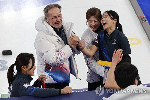 (코르티나담페초=연합뉴스) 서대연 기자 = 16일(현지시간) 이탈리아 코르티나담페초 컬링 올림픽 스타디움에서 열린 2026 밀라노ㆍ코르티나담페초 동계올림픽 컬링 여자 라운드로빈 한국과 중국의 경기에서 10-9로 승리를 거둔 한국 대표팀 선수들이 기 헤밍스 감독과 함께 기뻐하고 있다. 2026.2.17 dwise@yna.co.kr ▶제보는 카카오톡 okjeb