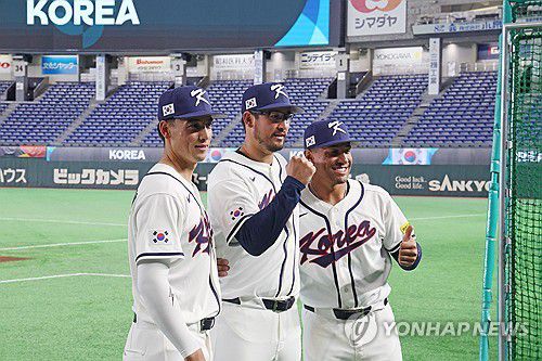 (도쿄=연합뉴스) 임화영 기자 = 월드베이스볼클래식(WBC) 개막을 하루 앞둔 4일 일본 도쿄돔에서 훈련을 마친 한국 대표팀 셰이 위트컴(왼쪽부터), 데인 더닝, 저마이 존스가 기념촬영하고 있다. 2026.3.4 hwayoung7@yna.co.kr ▶제보는 카카오톡 okjebo ▶연합뉴스 앱 지금 바로 다운받기~ ▶네이버 연합뉴스 채널 구독하기 <저작권자(