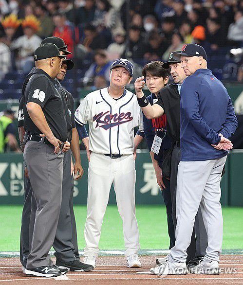 (도쿄=연합뉴스) 임화영 기자 = 5일 일본 도코돔에서 열린 2026 월드베이스볼클래식(WBC) 조별리그 C조 1차전 한국과 체코의 경기에 앞서 류지현 감독이 상대팀 감독과 라인업 교환을 한 뒤 심판의 설명을 듣고 있다. 2026.3.5 hwayoung7@yna.co.kr ▶제보는 카카오톡 okjebo ▶연합뉴스 앱 지금 바로 다운받기~ ▶네이버 연합뉴스