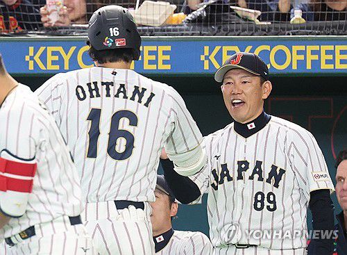 (도쿄=연합뉴스) 임화영 기자 = 7일 일본 도쿄돔에서 열린 2026 월드베이스볼클래식(WBC) 조별리그 C조 2차전 대한민국과 일본의 경기. 3회말 1사 일본 오타니 쇼헤이가 솔로 홈런을 친 뒤 이바타 히로카즈 감독과 자축하고 있다. 2026.3.7 hwayoung7@yna.co.kr ▶제보는 카카오톡 okjebo ▶연합뉴스 앱 지금 바로 다운받기~ ▶네