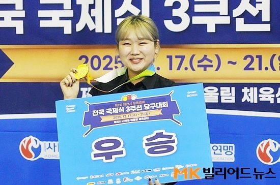 박세정이 20일 충북 제천시 어울림체육센터에서 열린 ‘제1회 제천 청풍호배 전국3쿠션당구대회’ 여자3쿠션 결승에서 허채원을 꺾고 전국대회 첫 우승컵을 들었다. 시상식 후 포즈를 취하고 있는 박세정. 20일 제천 청풍호배 女3쿠션 결승, 박세정, 허채원 꺾고 전국대회 첫 우승, 국내 1~3위 김하은 허채원 최봄이 연파, 공동3위 최봄이 백가인 박세정이 전국당