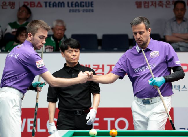 사진 | 프로당구협회 사진 | 프로당구협회 개막 3연패에 빠졌던 하이원리조트와 휴온스가 나란히 시즌 첫 승을 신고했다. 하이원리조트는 25일 경기도 고양시에 있는 킨텍스 PBA 스타디움에서 열린 ‘웰컴저축은행 PBA 팀리그 2025-2026’ 1라운드 나흘째 경기에서 우리금융캐피탈은 세트스코어 4-2로 제압했다. 휴온스도 크라운해태를 4-2로 이겼다. 양