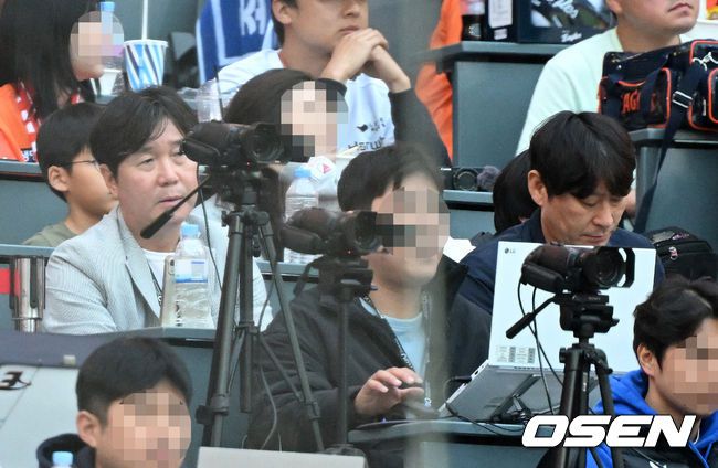 프로야구 한화 이글스가 첫 판을 승리하고, 한국시리즈 진출 확률 76.5%를 잡았다. 한화는18일 대전 한화생명볼파크에서 열린 2025 KBO리그 플레이오프(5전 3선승제) 1차전 삼성 라이온즈와 경기에서 9-8재역전 승리를 거뒀다. 류지현 감독과 강인권 코치가 경기를 바라보고 있다. 2025.10.18 /sunday@osen.co.kr
