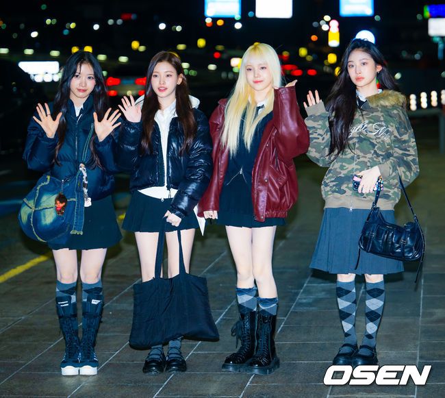 걸그룹 베이비돈크라이가 9일 오전 해외 일정차 김포국제공항을 통해 출국했다. 베이비돈크라이(Baby DONT Cry-이현, 쿠미, 미아, 베니)는 최근 두 번째 디지털 싱글 ‘아이 돈트 케어’를 발매했다. 베이비돈크라이가 출국길에 오르며 포즈를 취하고 있다. 2025.12.09 /rumi@osen.co.kr