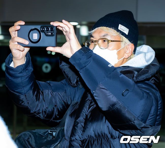 방송인 노홍철과 추성훈이 12일 오전 해외 일정 차 김포국제공항을 통해 출국했다. 김태호 PD가 방송인 노홍철과 추성훈이 출국하는 모습을 핸드폰에 담고 있다. 2025.12.12 /rumi@osen.co.kr