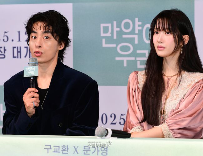 배우 구교환(왼쪽)과 문가영. 영화 ‘만약에 우리’ 언론시사회가 18일 오후 용산 CGV에서 열렸다. 이날 시사회와 기자간담회에는 출연배우 구교환, 문가영과 김도영 감독 등이 참석했다. [ⓒ 매일경제 & mk.co.kr, 무단 전재, 재배포 및 AI학습 이용 금지]