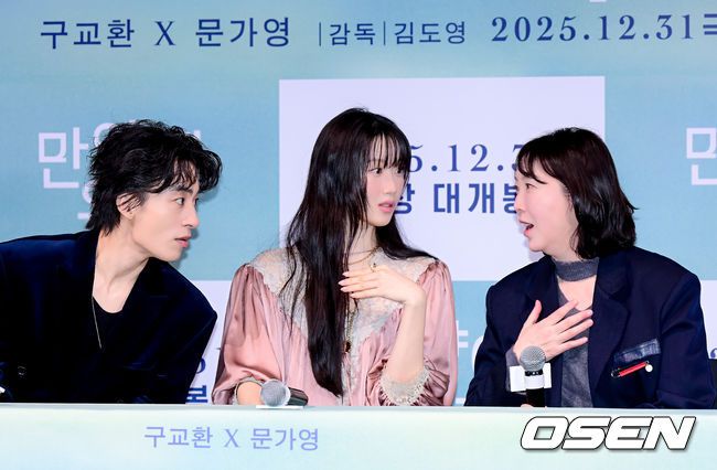 18일 오후 서울 CGV 용산아이파크몰에서 영화 ‘만약에 우리는’ 언론시사회&기자간담회가 열렸다. 배우 ‘구교환, 문가영이 출연하는 ‘만약에 우리'는 뜨겁게 사랑했던 은호와 정원이 10년 만에 우연히 재회하며 기억의 흔적을 펼쳐보는 현실공감연애. 배우 구교환, 문가영, 김도영 감독이 간담회를 하고 있다. 2025.12.8 /jpnews@osen.co.kr